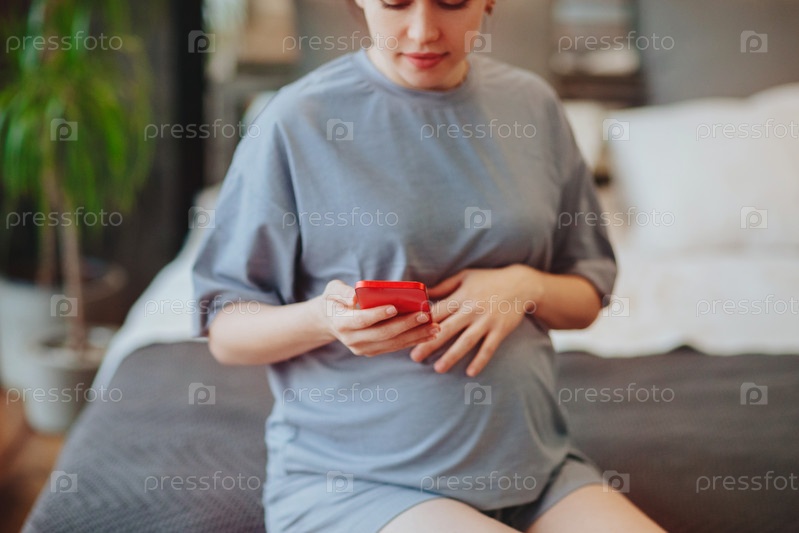 Молодая улыбающаяся беременная женщина трогает живот, разговаривая по мобильному телефону с другом, проводя время дома