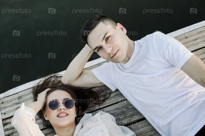 Молодая пара отдыхает на пирсе летом