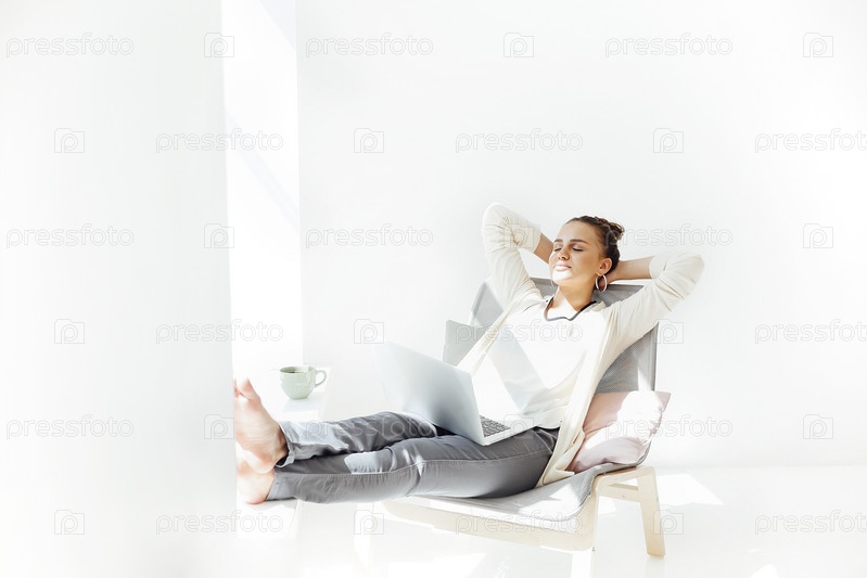 Молодая женщина отдыхает с ноутбуком