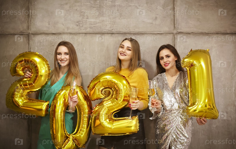Гламурные молодые женщины с блестящими золотыми номерами на воздушных шарах 2021