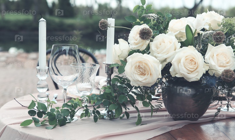Свечи и ваза с белыми розами на круглом столе возле бокалов