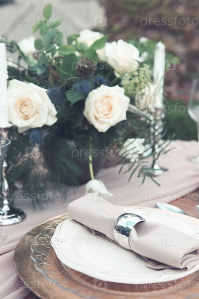 Свечи и ваза с белыми розами на круглом столе возле бокалов