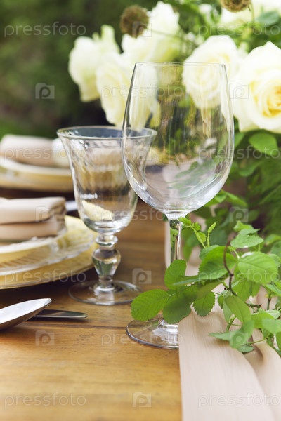 Свечи и ваза с белыми розами на круглом столе возле бокалов