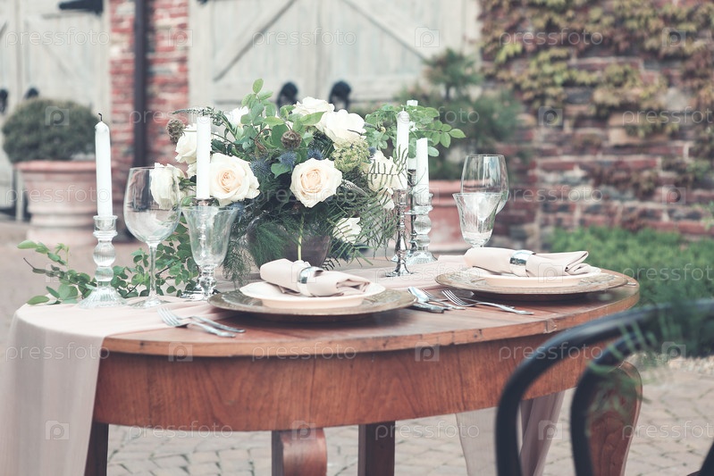 Свечи и ваза с белыми розами на круглом столе возле бокалов