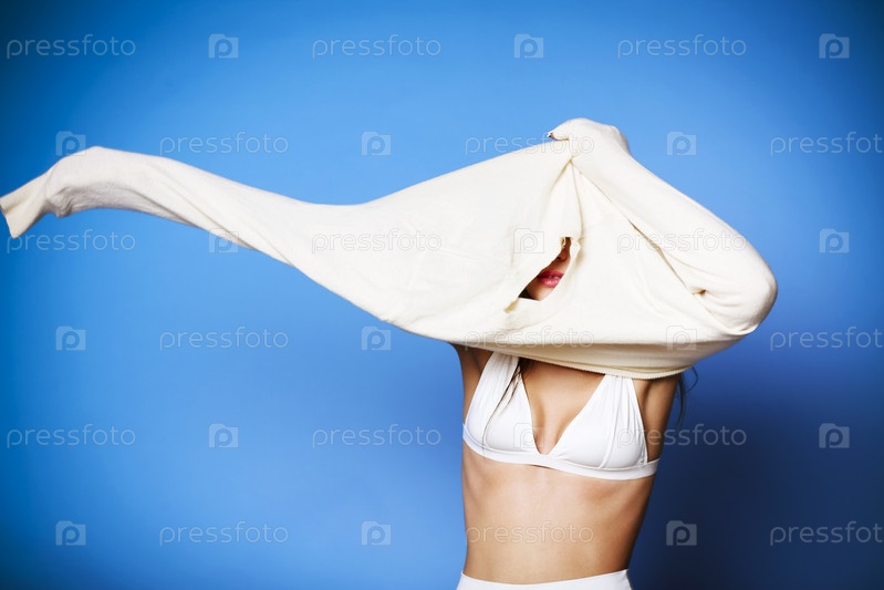 молодая женщина улыбается и снимает мягкий и теплый свитер на синем фоне