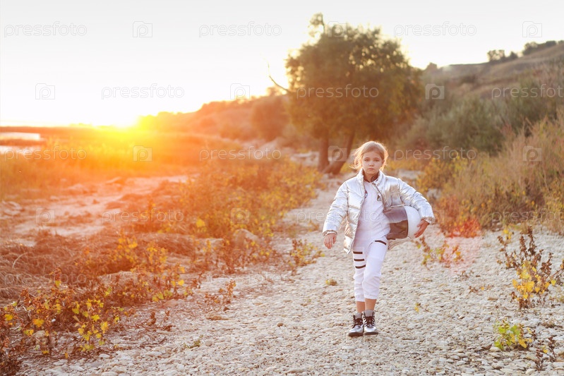 Футуристическая девочка-астронавт в белой полной форме и шлеме в серебряных туфлях на открытом воздухе