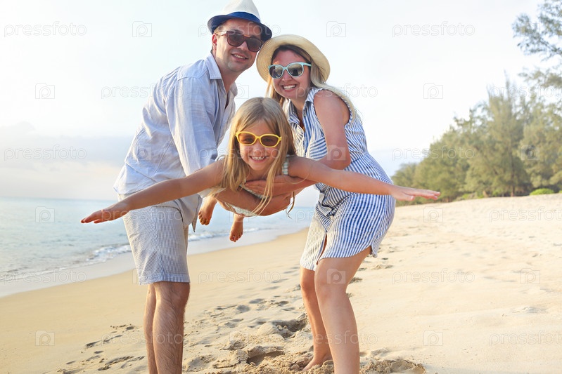Счастливая семья на пляже. Люди веселятся на летних каникулах. Отец, мать и ребенок на фоне синего моря и пляжа