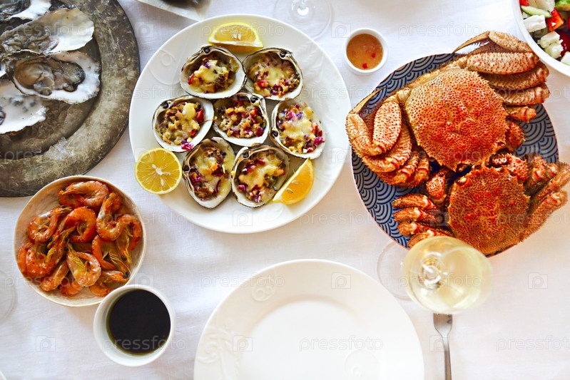 морепродукты и белое вино на столе
