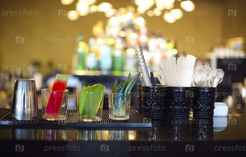 Барная стойка с бутылками на размытом фоне