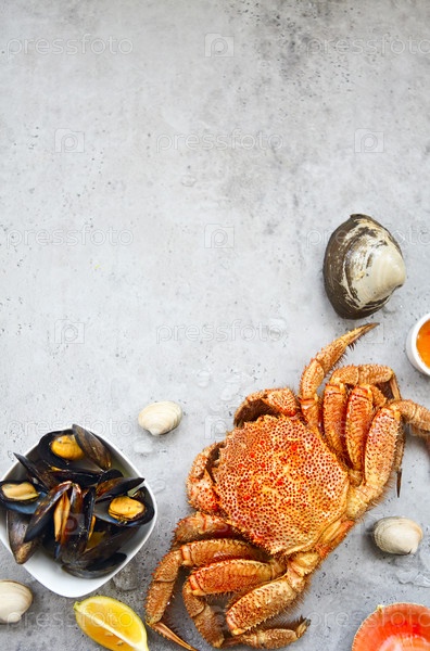 Свежее разнообразие морепродуктов на сером кухонном столе