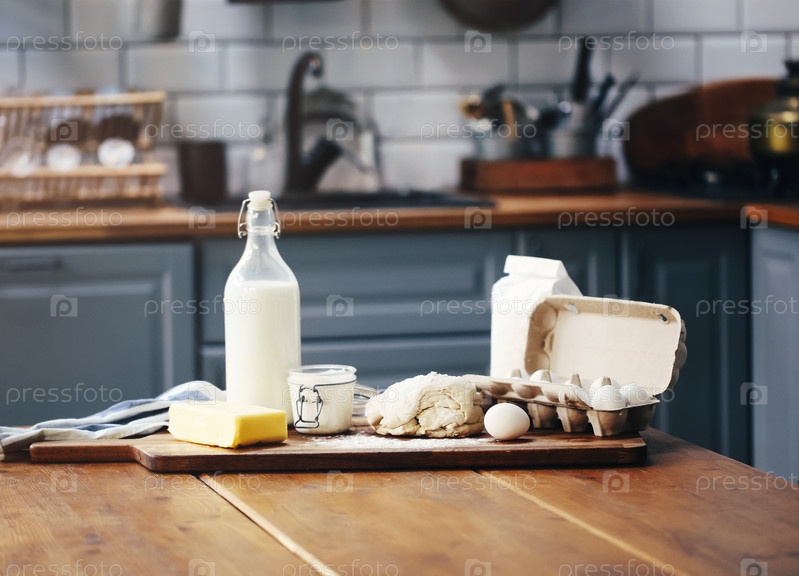 Ассорти ингредиентов для приготовления кондитерских изделий на деревянной разделочной доске на столе на кухне