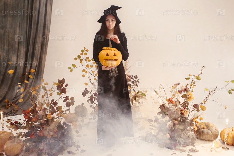 Женщина в костюме ведьмы с тыквой