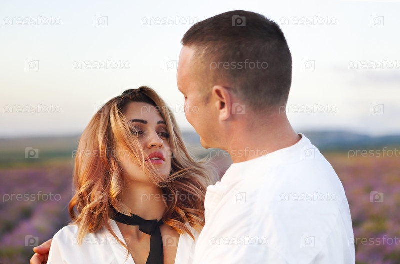 Милая молодая счастливая влюбленная пара в поле цветов лаванды. Насладитесь моментом счастья и любви на лавандовом поле