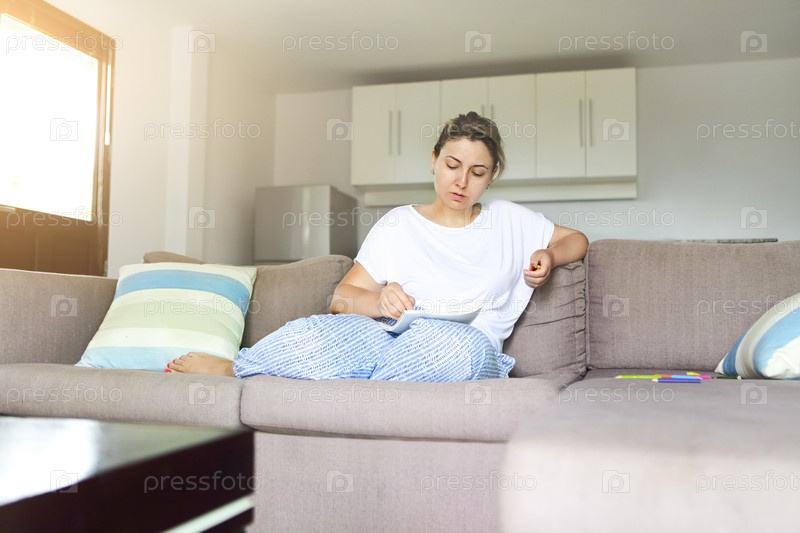Привлекательный дизайнер делает рисунок карандашом в гостиной