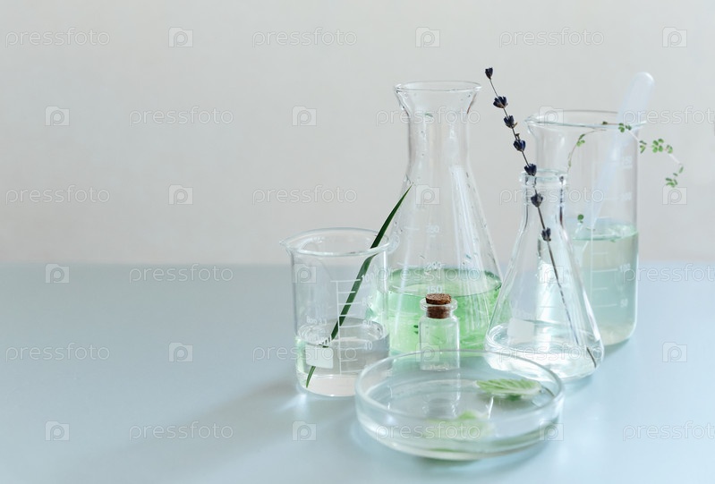 Различные бутылки на столе в лаборатории