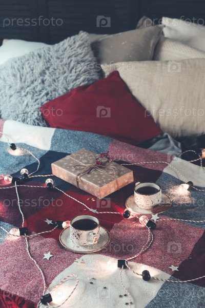 Уютная кровать с чашками кофе и подарочной коробкой