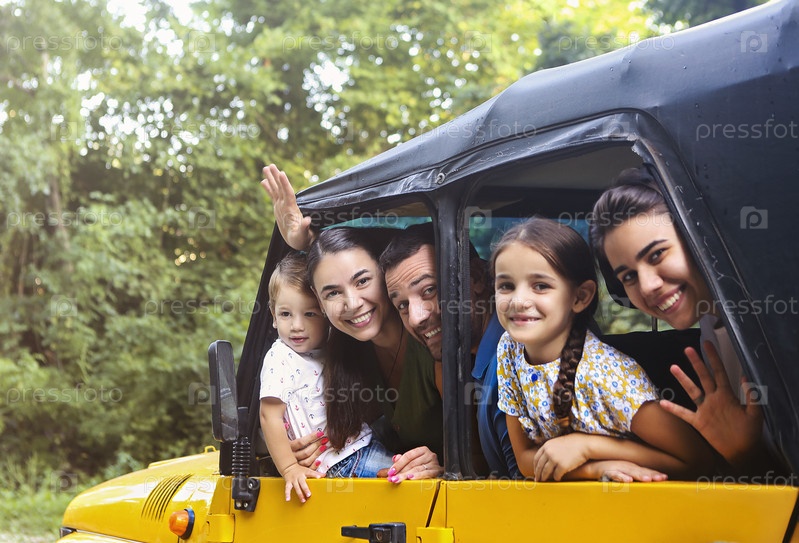 Счастливая улыбающаяся семья с детьми в машине на фоне горной реки