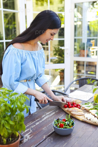 Молодая женщина готовит ужин дома в саду