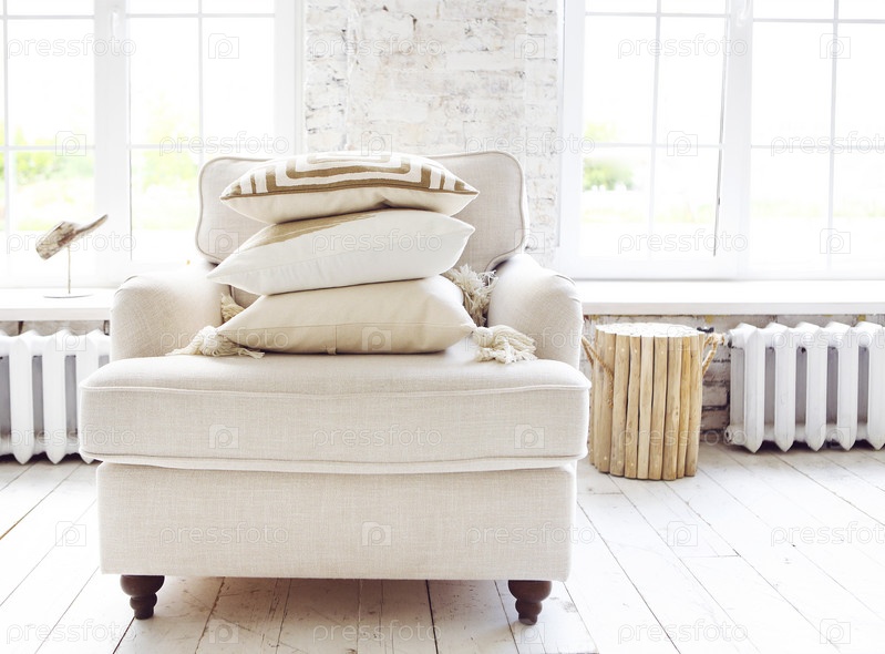 Белое кресло стоит на полу перед окном