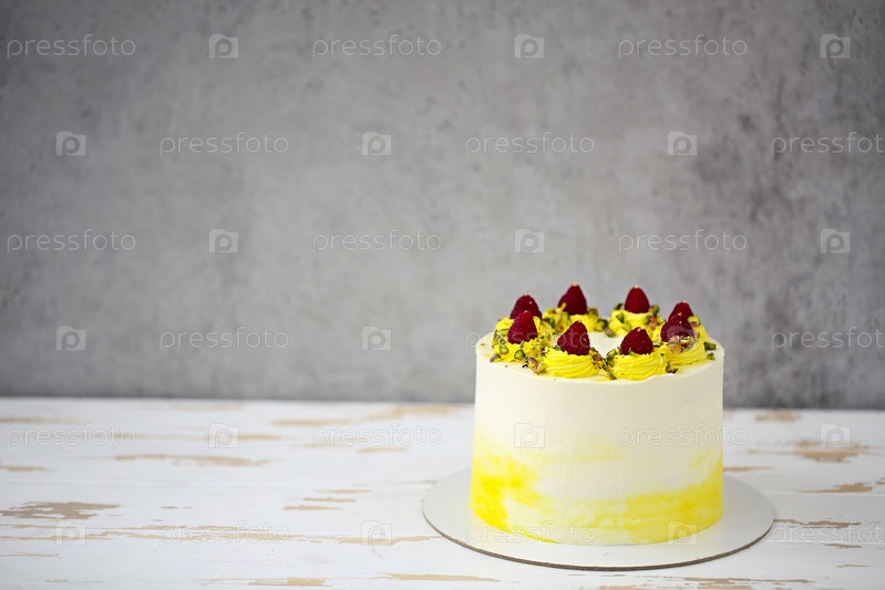 Красивый торт ко дню рождения с маскарпоне, украшенный малиной, фисташками
