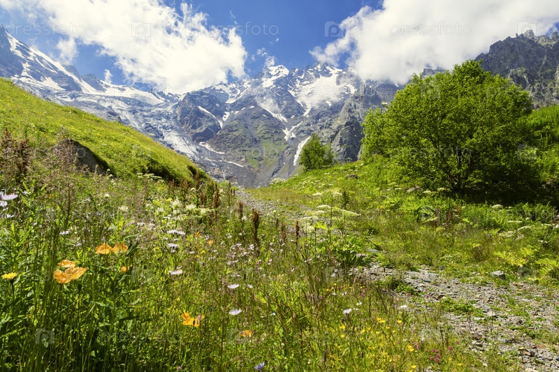 Вид на горный ледник с альпийских лугов в горах Кавказа