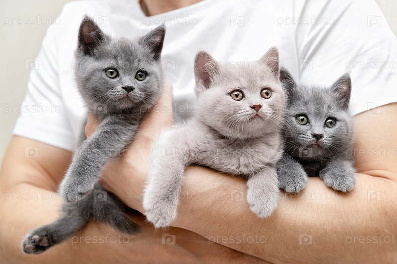 Заботливые мужские руки держат трех британских котят