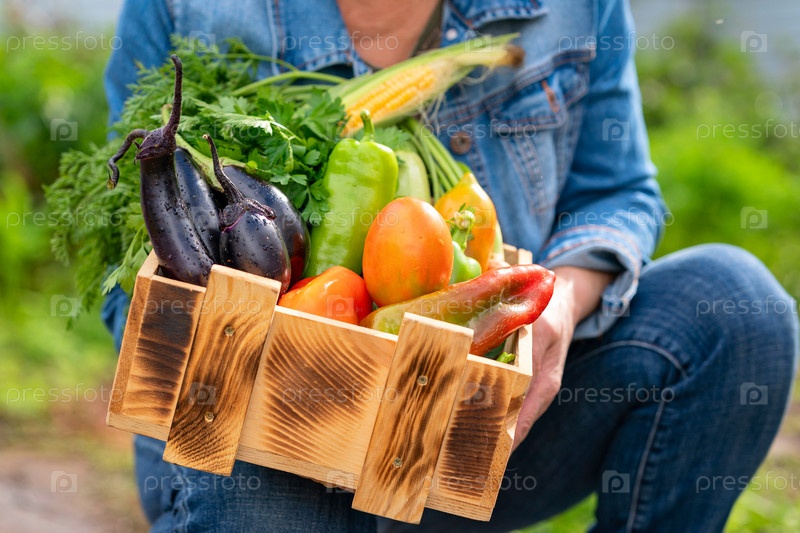 Женщина демонстрирует деревянный ящик с различными овощами. Деревянный ящик, наполненный свежими овощами, только что со своего огорода. Свежий, экологически чистый продукт