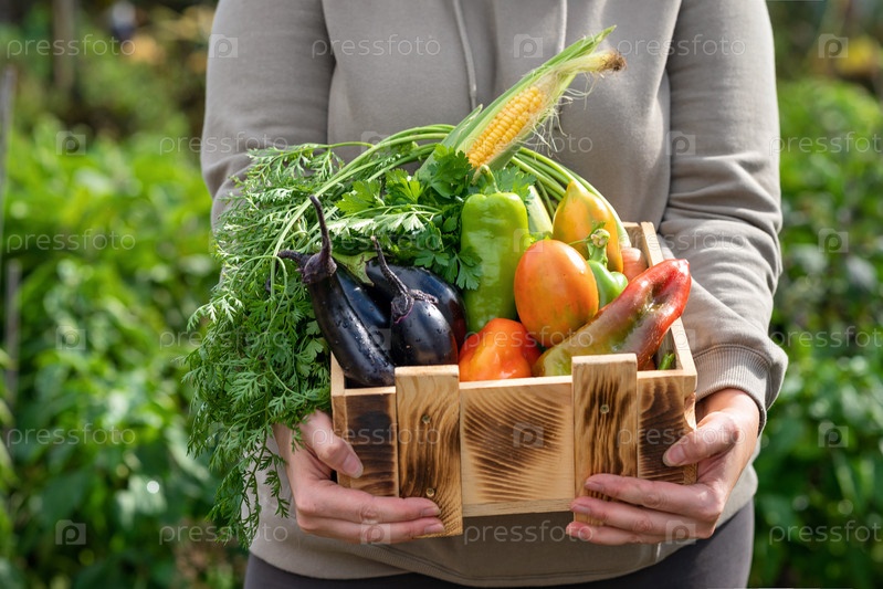 Женщина демонстрирует деревянный ящик с различными овощами. Деревянный ящик, наполненный свежими овощами, только что со своего огорода. Свежий, экологически чистый продукт