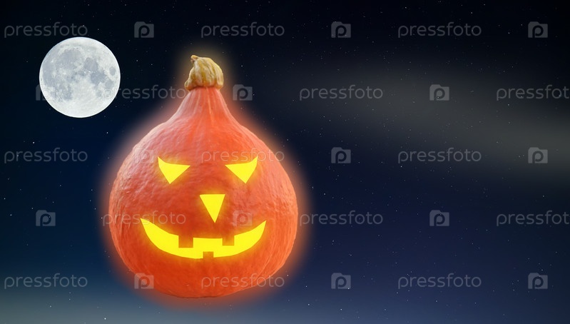 На фоне звездно-черного зловещего неба стоит оранжевый улыбающийся тыква.Фон Хэллоуина.Осенний праздник, ночь, страх.Поздравления, приглашения, баннер... 3D рендеринг