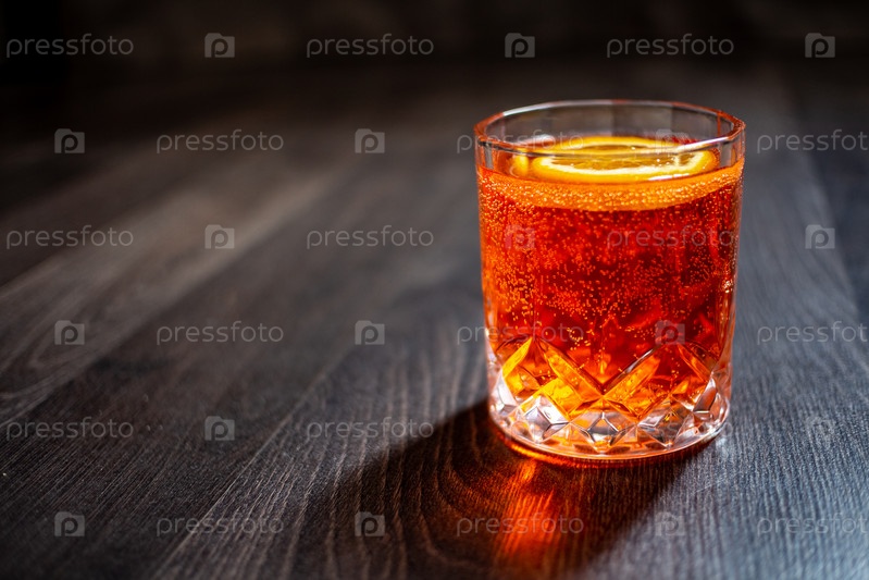 Стакан алкогольного напитка оранжевого цвета на деревянном столе