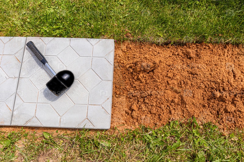 Резиновый строительный молоток для укладки тротуарной или садовой плитки на даче, коттедж лежит на белой каменной плите. вид сверху