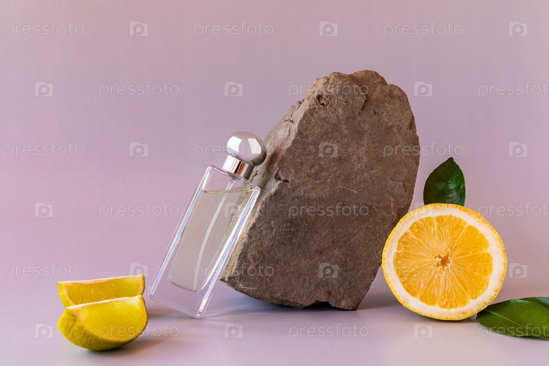 Флакон духов и композиция с натуральным камнем и дольками лимона. презентация аромата женских духов с нотками цитрусовых