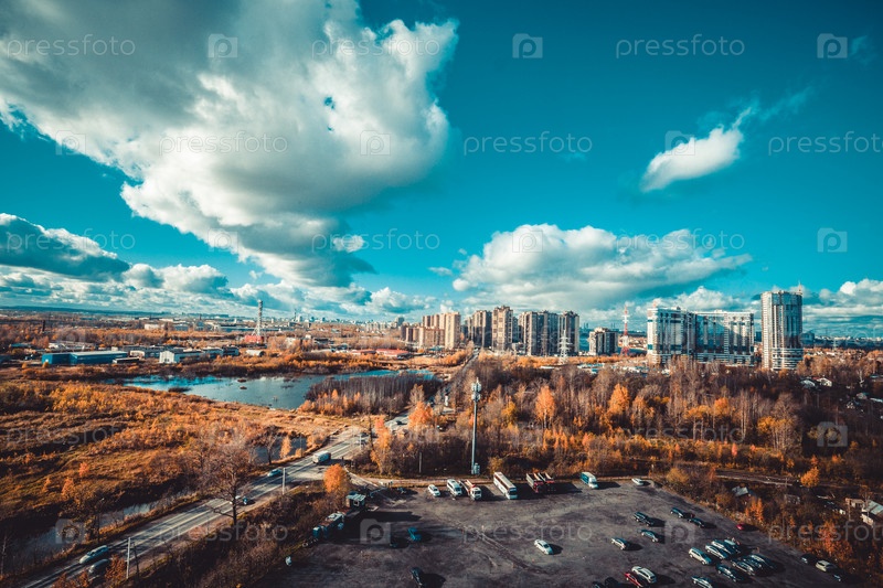 Панорамный вид на жилой комплекс на окраине города под голубым небом