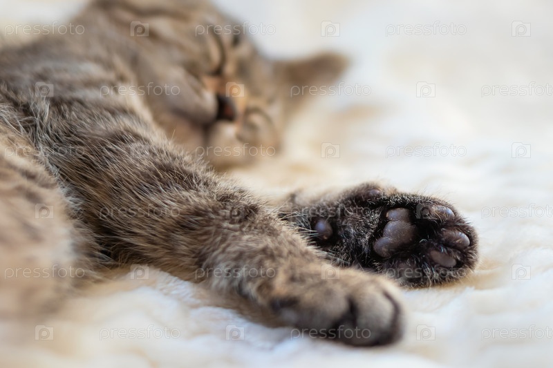 Симпатичный маленький серый полосатый котенок спит на кровати на теплом уютном бежевом одеяле. Концепция отдыха, релаксации, отпуска. Симпатичная открытка с домашним животным. Селективный фокус на лапе