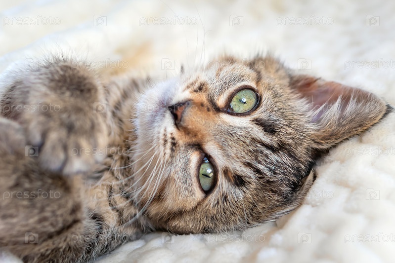 Симпатичный маленький серый полосатый котенок отдыхает на кровати на теплом уютном бежевом одеяле. Концепция отдыха, релаксации, отпуска. Симпатичная открытка с домашним животным