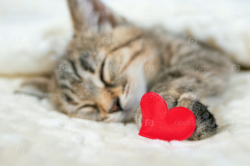 Крупный план красного сердца на фоне размытого маленького котенка, спящего на кровати на теплом уютном бежевом одеяле. Концепция любви и заботы о домашних животных. Симпатичная открытка с кошкой