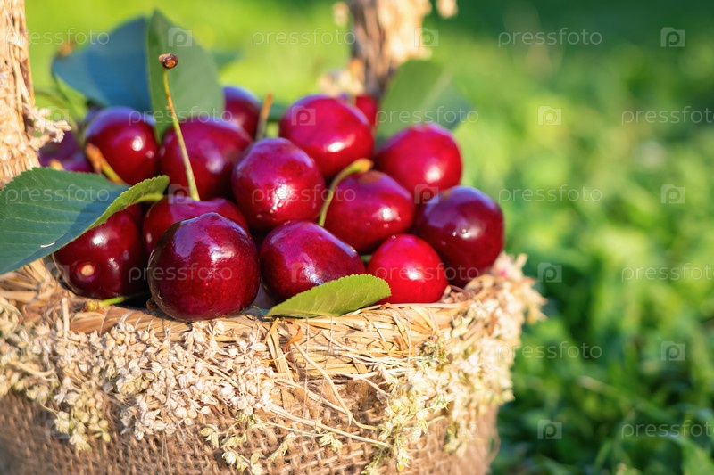 Ягоды спелых, сочных и свежих вишен в плетеной корзине на зеленой траве. Летний урожай