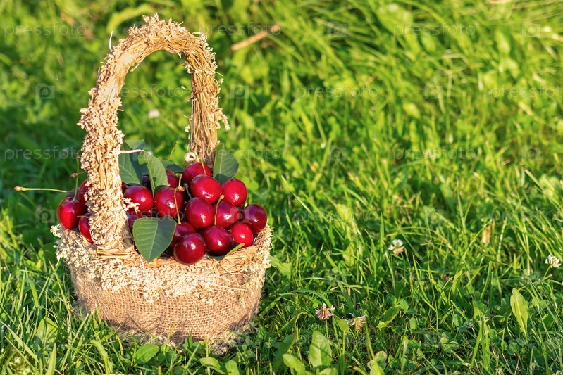 Ягоды спелых, сочных и свежих вишен в плетеной корзине на зеленой траве. Летний урожай