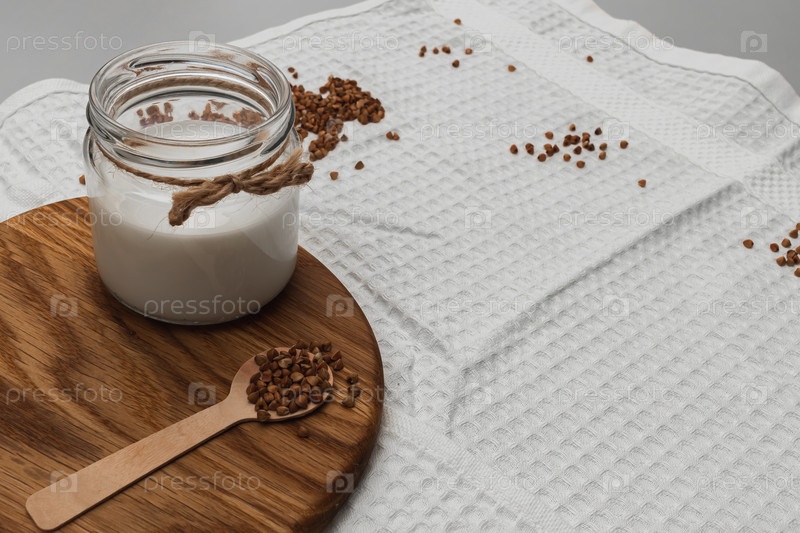 Концепция веганского молока. Баночка с альтернативным молочным продуктом и гречкой на деревянной доске. Здоровое питание. Нет аллергии. Нет лактозы. производство веганских продуктов в домашних условиях. Селективный фокус, пространство для копирования