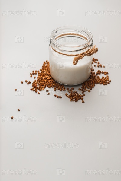 Баночка с веганским молоком и гречкой. Эко- и животноводческая концепция питания. Здоровое питание, диета. Не содержит лактозы. Скопируйте пространство, вертикальный, мягкий фокус