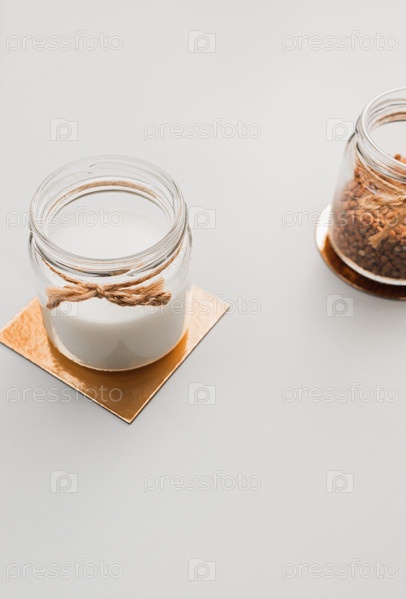 Ингредиенты для домашнего веганского молока. гречка в стеклянной банке, альтернативный молочный продукт. экологически чистая еда. без аллергии, без лактозы. крупный план, мягкий фокус, вертикальный