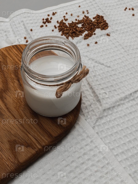 Баночка с альтернативным гречневым молоком на деревянной доске. Веганская еда для животных. осознанное питание. заботиться о своем здоровье. Молочный продукт без лактозы, без аллергии. Мягкий фокус, размытый фон