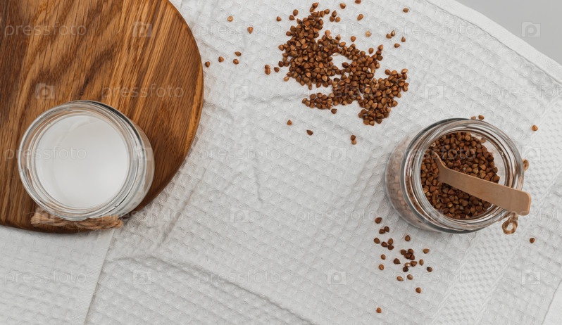 Набор на завтрак: гречка и веганское молоко для утренней каши. Молочный продукт на растительной основе. Сбалансированная диета. Экологически чистый, без пластика, без лактозы. Вид сверху. Копировать пространство