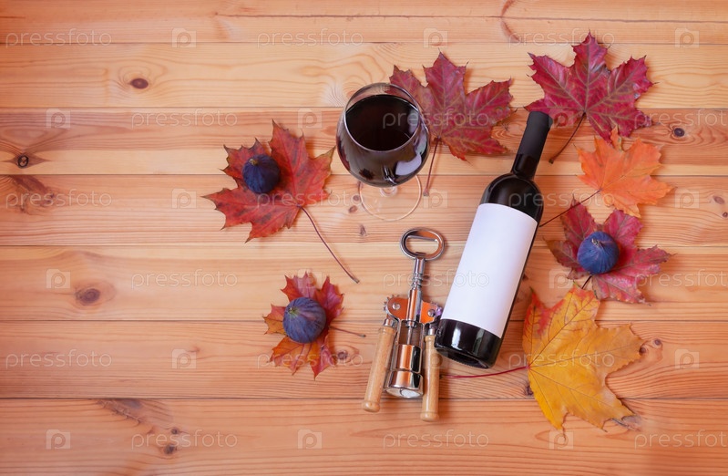 Бокал красного вина, бутылка вина, осенние листья, инжир и штопор. Вид сверху, пространство для копирования