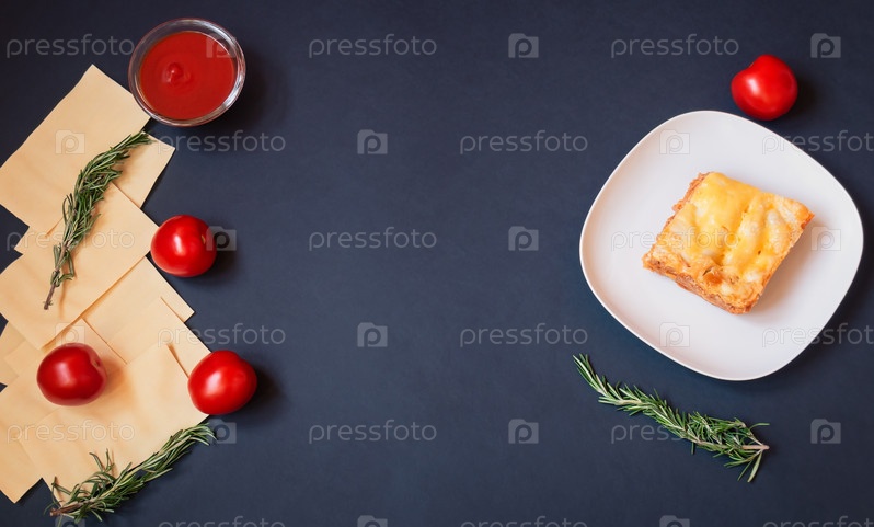 Сырье для лазаньи и тарелка лазаньи болоньезе на темном фоне