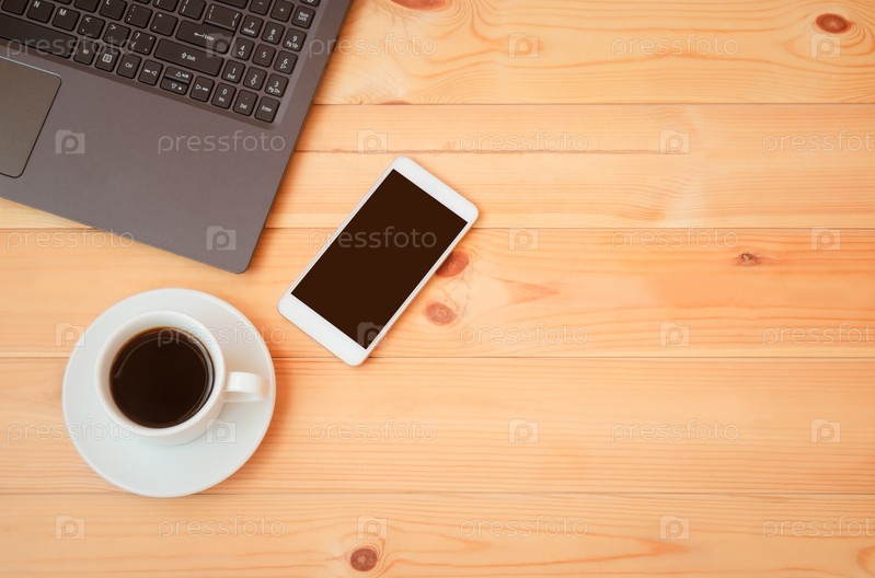 Рабочее место с клавиатурой, смартфоном и чашкой кофе
