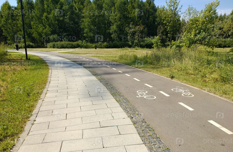 Двухполосная велосипедная дорожка в парке Митино летним днем