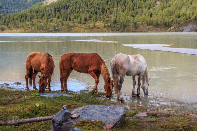 Алтай, лошади на реке пьют воду