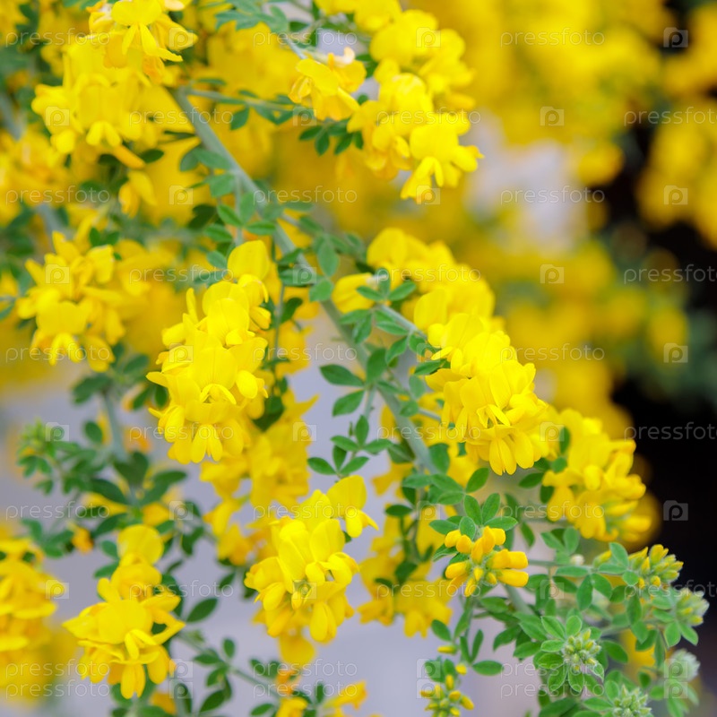Желтая акация цветет весной. Много мелких цветов на одной ветке