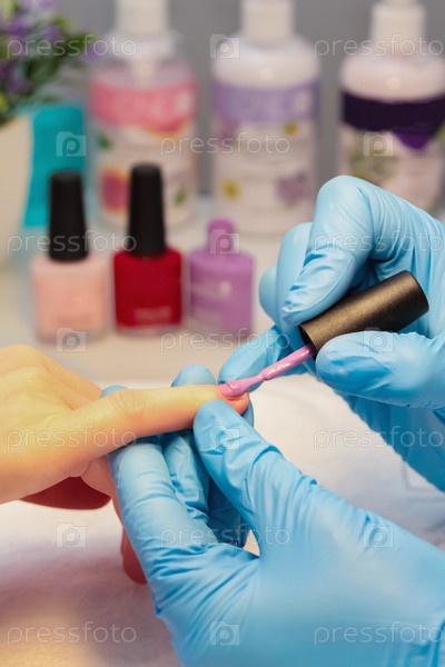 В салоне красоты женщине делают маникюр, красят ноготь лаком